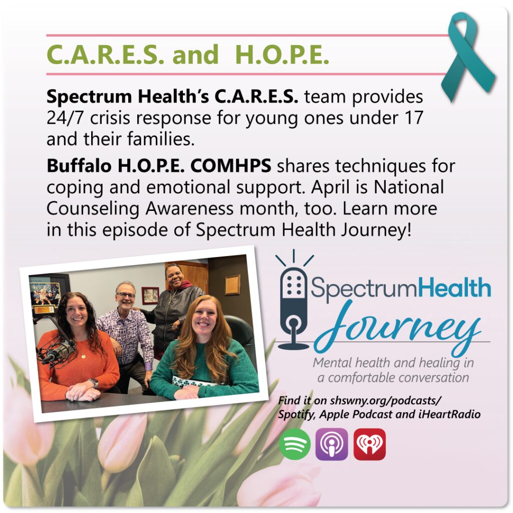 Spectrum Health’s C.A.R.E.S. team provides 24/7 crisis response for young ones under 17 and their families. Buffalo H.O.P.E. COMHPS shares techniques for coping and emotional support. April is National Counseling Awareness month, too. Learn more in this episode of Spectrum Health Journey!