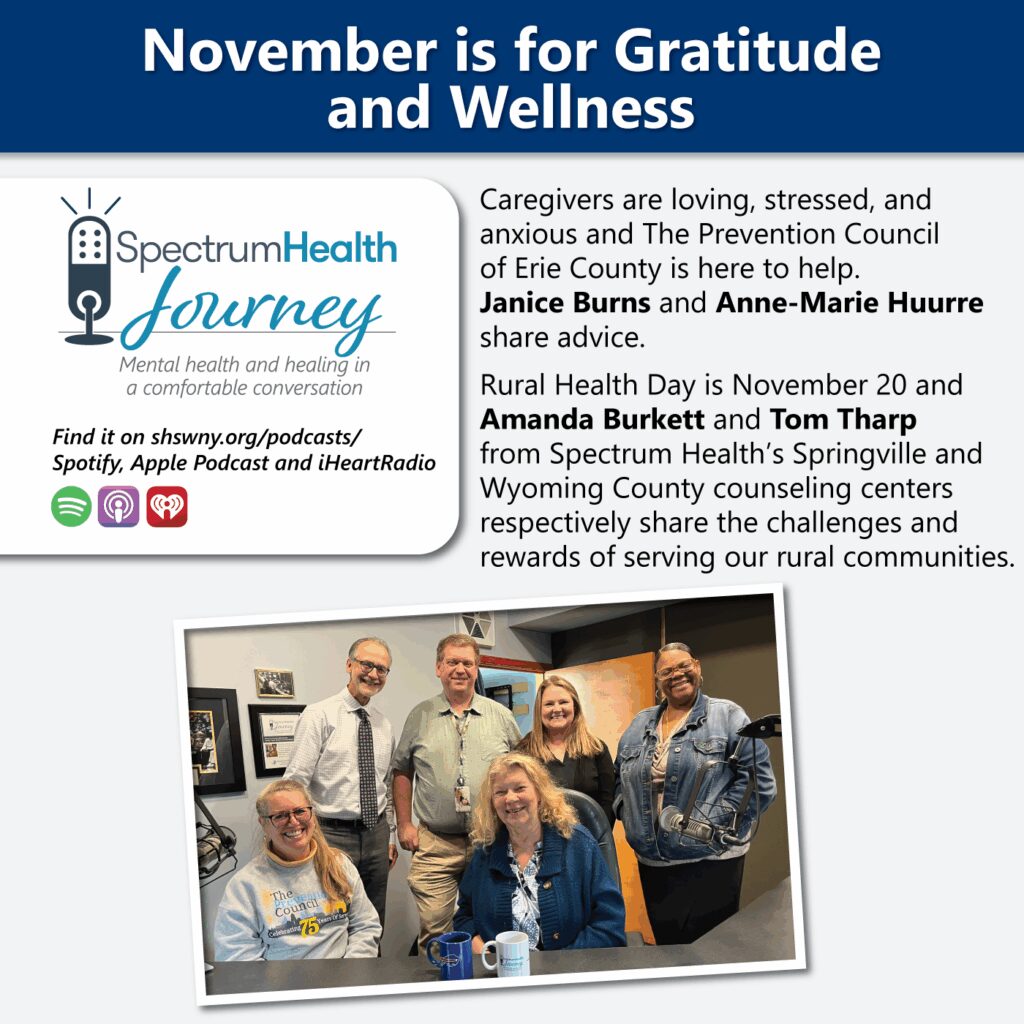 Caregivers are loving, stressed, and anxious. The Prevention Council of Erie County is here to help. Janice Burns and Anne-Marie Huurre share advice. Rural Health Day is November 20, and Amanda Burkett and Tom Tharp from Spectrum Health’s Springville and Wyoming County Counseling Centers respectively share the challenges and rewards of serving our rural communities.
